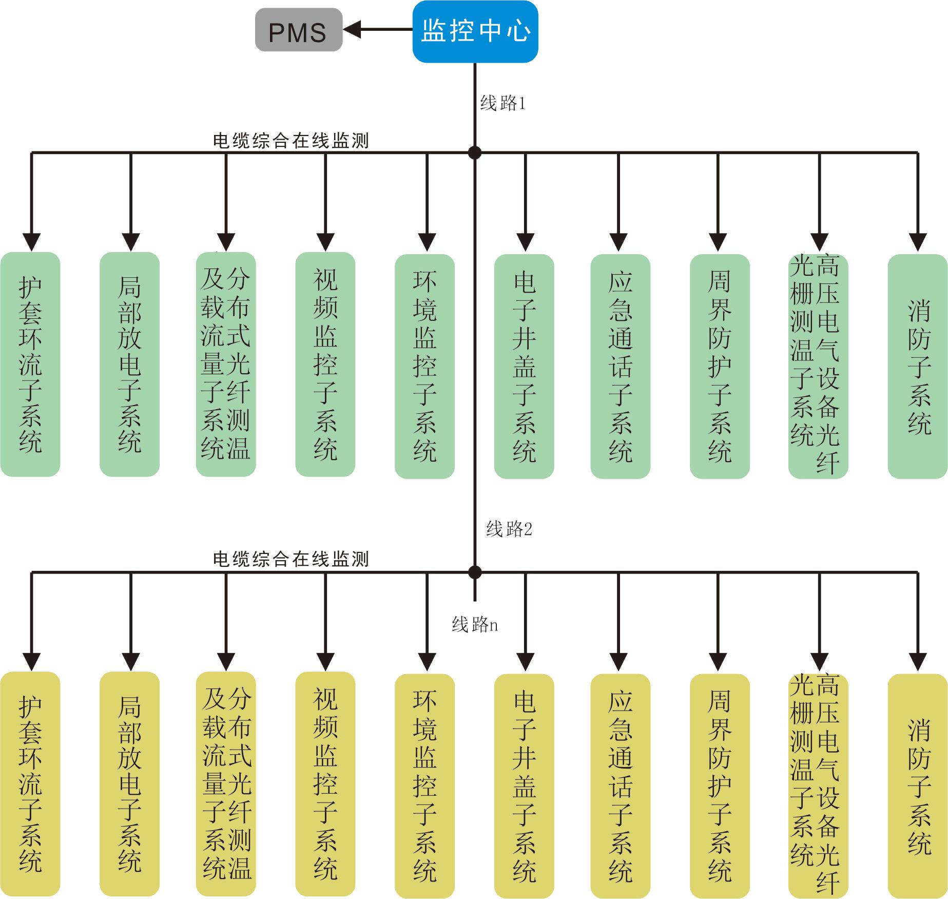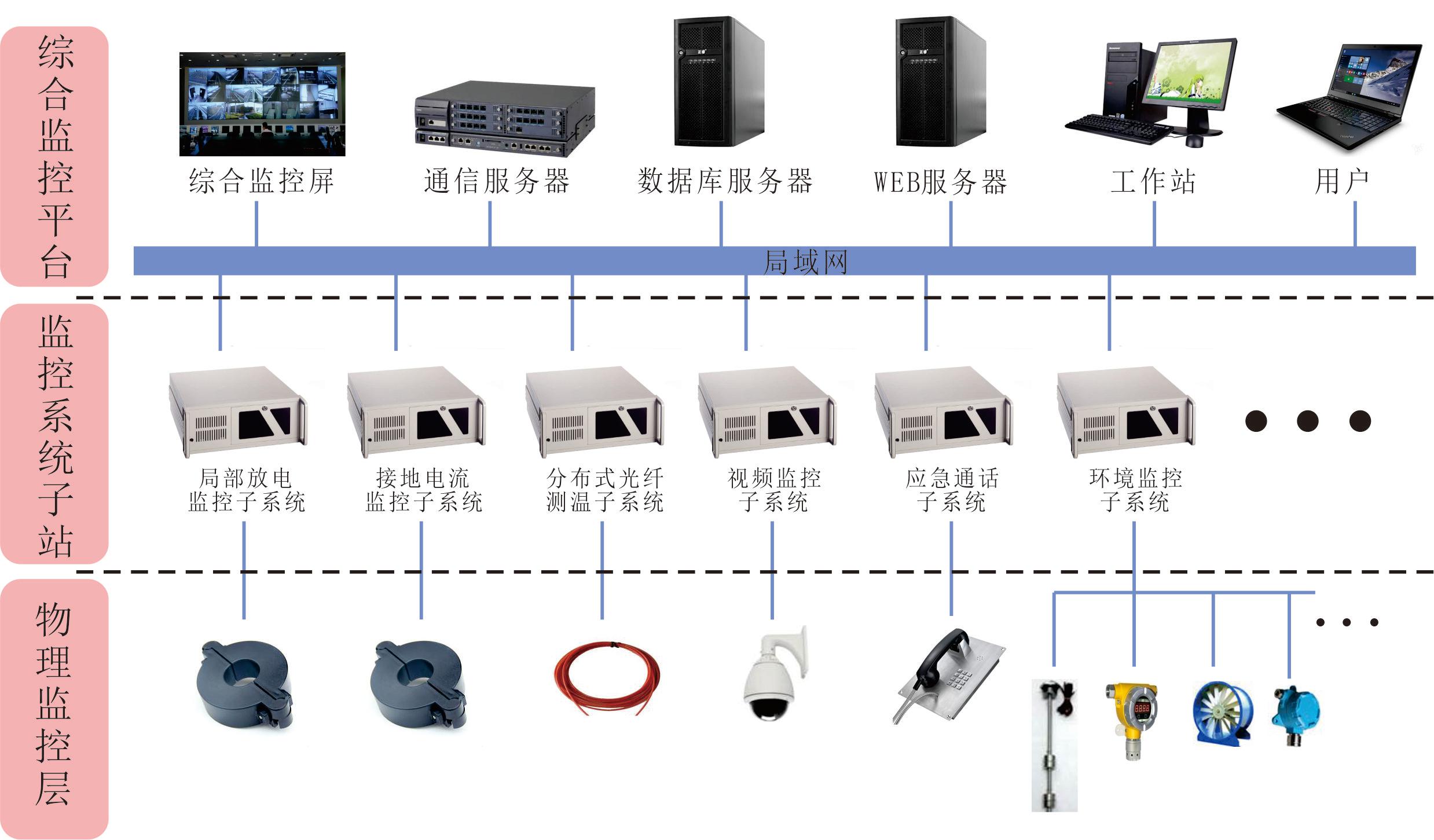 電纜綜合在線監(jiān)測系統(tǒng)是電力系統(tǒng)現(xiàn)代化、一體化、信息化的重要組成部分,是對電纜及其附屬設(shè)備運(yùn)行狀態(tài)進(jìn)行動態(tài)管理的有效手段,是電力系統(tǒng)安全、穩(wěn)定運(yùn)行的重要保障。該系統(tǒng)由護(hù)套環(huán)流子系統(tǒng)、局部放電子系統(tǒng)、分布式光纖測溫及載流量子系統(tǒng)、視頻監(jiān)控子系統(tǒng)、環(huán)境監(jiān)測子系統(tǒng)、電子井蓋子系統(tǒng)、應(yīng)急通話子系統(tǒng)、周界防護(hù)子系統(tǒng)、消防子系統(tǒng)、高壓電氣設(shè)備光纖光柵測溫子系統(tǒng)及后臺應(yīng)用管理平臺等多個(gè)部分組成。建立一體化的電纜運(yùn)行管理平臺,實(shí)現(xiàn)對電纜本體和隧道運(yùn)行情況的實(shí)時(shí)監(jiān)測、設(shè)備運(yùn)行管理以及高壓電纜突發(fā)事故應(yīng)急指揮等功能。