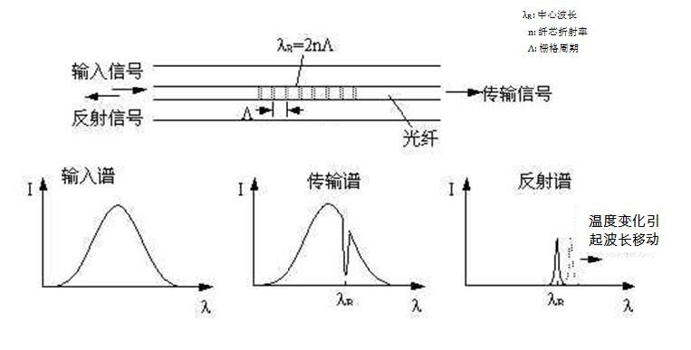 光柵也是普通單模光纖,作為光纖傳感器。但是光柵要經過特殊的加工處理以改變其折射率,使其只對特定的波長進行反射。這樣,一個寬譜的入射光經過光纖光柵后,只有滿足波長匹配條件的極小譜寬的光信號被反射,其余波長的光信號透射進入下一個光纖光柵。當環(huán)境溫度變化時,光纖光柵的反射光中心波長會隨之改變(溫度越高,波長偏移量越大)。通過對待測光柵的反射光中心波長進行數字化精確測量,即可獲得該光柵位置的環(huán)境溫度,如圖1所示。