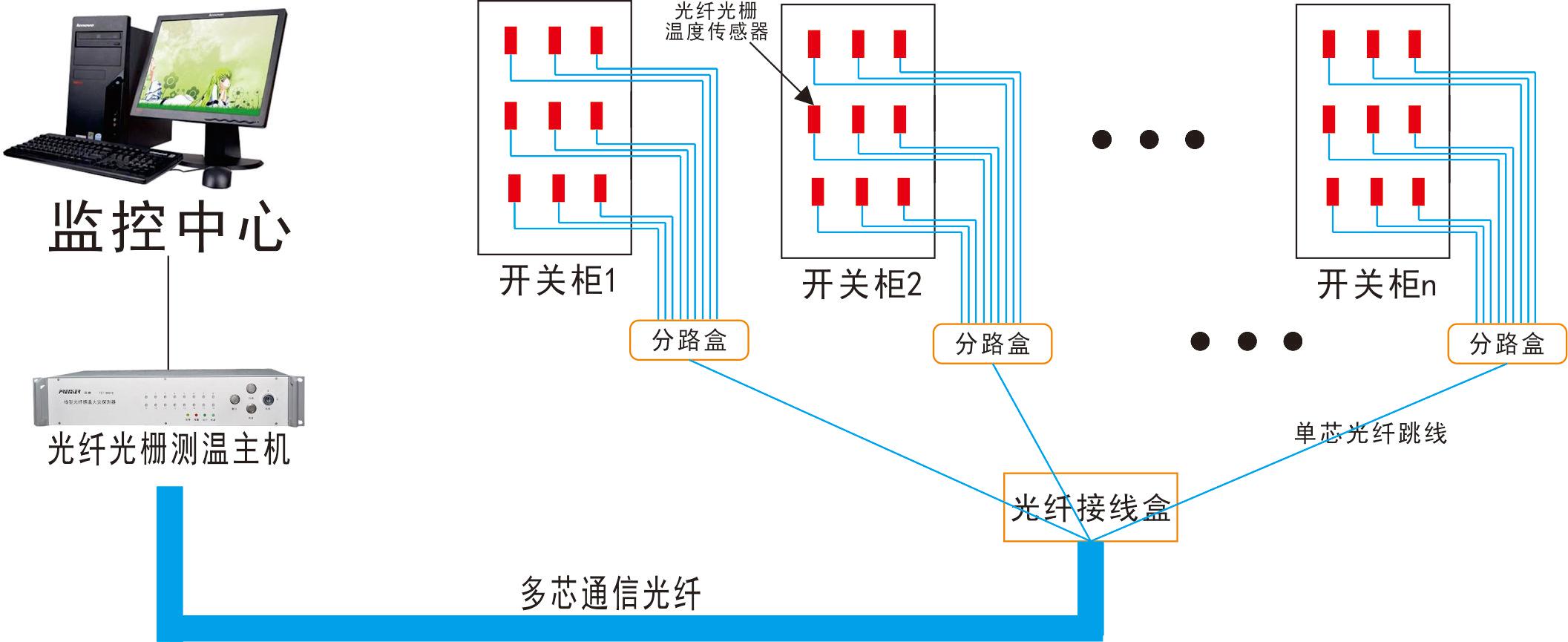 高壓電氣設(shè)備光纖光柵溫度在線監(jiān)測(cè)系統(tǒng)主要由光纖光柵解調(diào)儀和光纖光柵傳感器組成。通過(guò)多路光纜,將傳感器連接起來(lái)構(gòu)成電氣設(shè)備溫度監(jiān)測(cè)網(wǎng)絡(luò),通過(guò)以太網(wǎng)連接設(shè)備將光柵解調(diào)儀、上位機(jī)等構(gòu)成溫度監(jiān)測(cè)預(yù)警管理系統(tǒng),并可實(shí)現(xiàn)系統(tǒng)互聯(lián),溫度數(shù)據(jù)實(shí)時(shí)共享的功能。監(jiān)測(cè)裝置的終端設(shè)在各變電所高壓電纜沿線接頭等重要部位、高壓電纜頭等需要監(jiān)測(cè)的地方。
